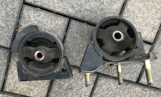 右が@、左がAです。下側のエンジンマウントです。これは在庫あり。そのためまずこの2カ所だけ交換してもらいました。が!エンジンの振動は止まりませんでした。 ぱっと見、マウントがちぎれているわけでもないのに……まぁ28年経っているのでへたっているのでしょうね(^^ゞ |