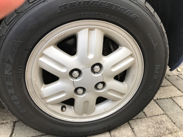 14インチの純正アルミです。タイヤサイズは195-60-14です。今や軽自動車でも15インチの時代……(ToT) 昔のカローラクラスは純正13インチ、スポーツグレードで14インチでした。 |