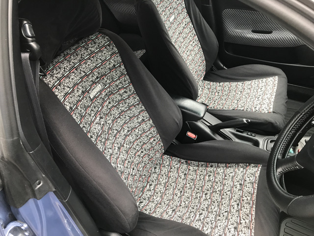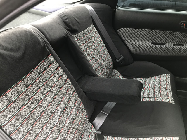 これ、分かります?!トヨタの純正オプションシートカバーがついているんですよ!当時の資料によると、フルシートカバーは全部で5種類あり、価格は17,000円〜28,000円だったそうです。このカバーが掛かっていたおかげで、シートは擦れや日焼けのないきれいな状態でした。きれいな状態を維持するために、シートカバーは洗濯し、再装着です。 |