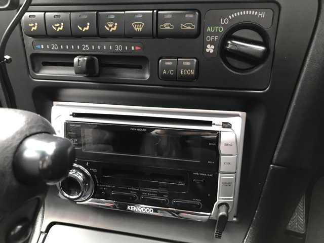 いまやオートエアコンは当たり前ですが……カローラにオートエアコン、高級です(笑) オーディオは前のオーナーさんが付け替えたのでしょう。CD/MDデッキです。MDっていつの間にか消えてしまいましたね…… もったいないので、このデッキにiPodをつなぎました。iPodももう売っていないんですね(^^ゞ |