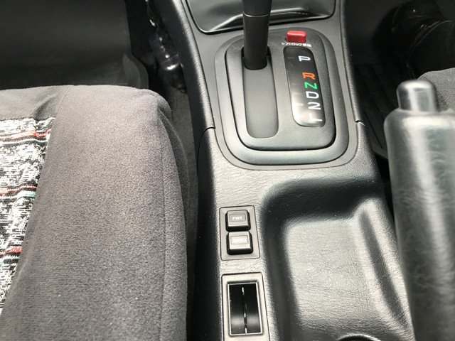 シフト周りです。真ん中に写っているスイッチは、ECT-Sといって、ATのマニュアルモード、パワーモードの切り替えスイッチです。最近の車にはついていないですよね(^^ゞ スイッチの後ろにはコインケースが……時代ですね(^^ゞ |