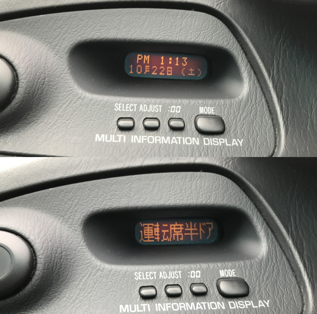 エクストラパッケージの目玉である、マルチインフォメーションディスプレイです。当時の最先端です。液晶が一部とんでしまっているのが残念です(ToT) |