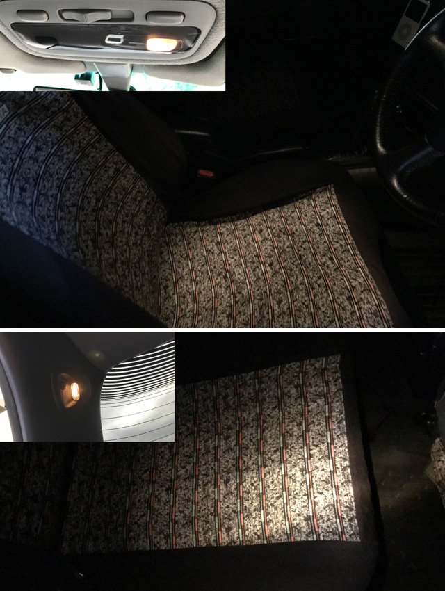 セレスのライティングシステムもかなり高級です。各シート毎にリーディングランプがついています。手動でオンオフできることはもちろん、ドアを開けたとき、その席だけを照らしてくれます。カローラなのにこんな装備……バブルの香りが漂ってきます。(笑) 上の写真が運転席、下の写真が後席です。 フロントはルームミラー上部に、リアはCピラーにリーディングランプがついています。 |