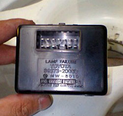 | −ランプフェイリア(断線警告灯ユニット)− テールランプの内側にあり、雨水浸入によりテールの球切れ警告灯を誤作動させてくれるユニットです。ほとんどの方が経験している不具合ではないでしょうか。 写真はのぞさん所有の前期型のランプフェイリアです。黒です・・・みなさんの車はいかがですか?ほとんどの方が白ではないでしょうか。現在の所、年式による違いという見方が強いですが真相は如何に!? |
