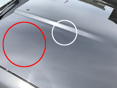 タワーバーが当たっていた部分がかろうじて分かる写真です。塗装にひびが入っています。ここの他にも手で触ると明らかにぼこっと出っ張っている部分があります。 遠目には分かりませんが、気に入らないので直してもらいました。 |