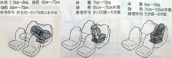冒頭にも書きましたとおり、新生児から4才くらいまで使用可能です。今回、全パターンを実施しましたが、新生児のパターン(一番左の図)と、1〜4才までのパターン(一番右の図)は取り付け可能でしたが、6ヶ月〜1才までのパターン(中央の図)は70の後部座席では非常に難しいと思われます。