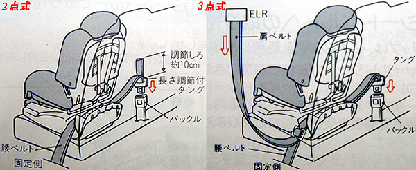 2点式、3点式の取り付け方法です。基本的に腰ベルトで止めるだけなので、どちらでも装着可能というわけです。