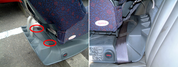実際の装着方法ですが、左図の赤丸の部分がシートベルトを引っかける場所になります。この二カ所にシートベルトを通してチャイルドシートを固定します。右図は実際にシートベルトを通して装着したところです。