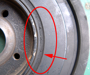 赤丸の部分を見てください。溝になっているのですがこの部分がゴムブッシュになっています。矢印の部分にはうっすらと亀裂が入っているのが分かります。これがどんどん広がって最後には支えきれなくなり、プーリーが落ちます。