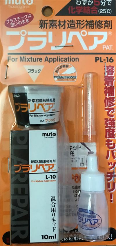 | これがプラリペアです。武藤商事という会社から出されています。販売元によりますと、全国のオートバックスやジョイフル本田でも販売しているとのこと。うちの近所のオートバックスにはありませんでしたが…(;´∀`) 使い方はネット上に出ていますので検索してみてください。ただ…これ、言うほど簡単では無く、結構難しい接着剤です。何度も失敗しました。液と粉を混合させるのですが、それがなかなかうまくいかなくて…しかもすぐに硬化してしまうので迅速さも必要です。試行錯誤してみてください(;´Д`) | |