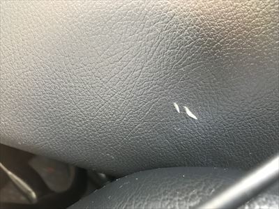 | これがうちの子に見つかった小さな亀裂です。爪の先ほども物が2箇所ありました。場所は、運転席側Aピラーのすぐ脇です。写真下に映っているもっこりした黒い樹脂部分は、Aピラーに付けている追加メーターです。 こんな小さな物ですから気にしなくても良いと思っていたのですが、仲間から「これ、放っておくと亀裂が繋がって一気に割れるぞ!」と脅されました。(笑) | |
