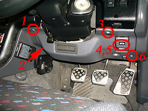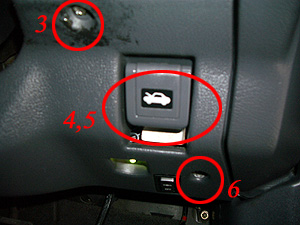 赤○3〜6のアップです。4,5はボンネットオープナーの裏側に隠れています。ボンネットを開けるようにオープナーを引き、そのままの状態でネジを外します。