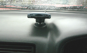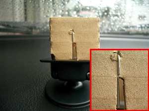 ダッシュボードにETCの台座を取り付けるのですが、とりあえず仮止めにしておきます。このとき、付属の角度測定ゲージ(ダンボールの物でそこにゼムクリップを加工して取り付けた物)で取り付け角度を確認します。写真のように、ダンボールのゲージの切れ目の部分にクリップ(銀色の物)が来るように角度を決めます。この写真では左右方向しかありませんが、前後方向も同じように、角度を測定・決定します。 |