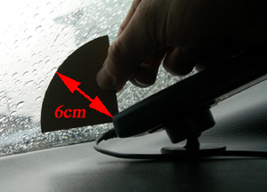 次に、ETC本体を台座に仮止めし、付属のゲージ(扇形のダンボール)で、ETC先端からフロントウインドウまでが6cm以上になるように位置を決定します。位置が決まったら、台座、本体ともに両面テープで固定します。 |