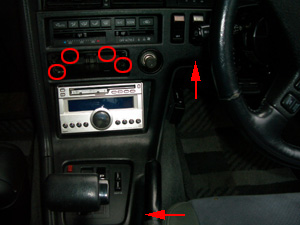 オーディオの裏側から電源を取るに当たり、センターコンソールを外さなければいけません。写真の赤丸・矢印の部分のネジを外すとセンターコンソールが外れます。 |
