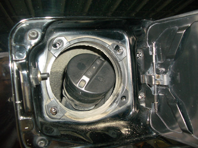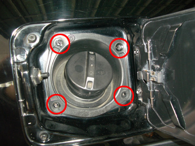 燃料タンクを下ろさなければいけないのですが、まず最初に給油口を開けて赤丸内のねじを4本外しておきます。 |