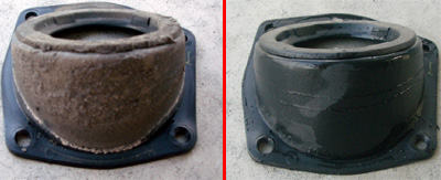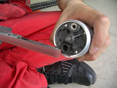 つぎはGTRポンプ側の加工です。ポンプ本体の周りにあるゴムをカッターなどで切って外します。 |