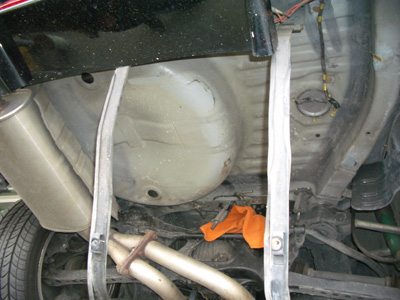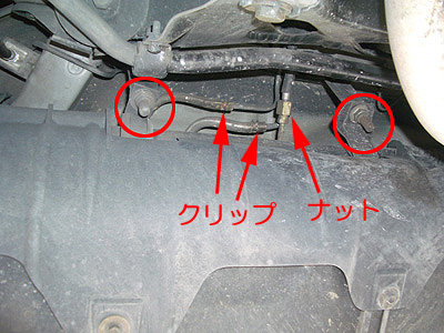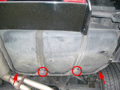 この写真はカバーが付いていますが気にしないで・・・(;^_^A 3本の配管があります。これを抜きます。2本はクリップで留まっているだけなので簡単に抜けますが、一番太いナットでつながっているラインがなかなか外れない・・・潤滑剤などをあらかじめかけておくと外しやすくなります。レンチを使って回しますが、配管がねじれないように(折れないように)気をつけてください。このとき、ガソリンが垂れてきますのでかぶらないように気をつけてください。タバコも危ないのでやめましょう~~~-y( ̄Д ̄)。o0○ 配管を外したら次は赤丸内のナットを外します。すると、燃料タンクを支えているベルトが外れます。タンクを落とさないように支えながらゆっくりタンクを下ろしましょう。ミッションジャッキがあると楽です。人力だとかなり辛そうです。私は今回とあるお店のピットを借りられたのでミッションジャッキを使用して下ろしました。 |