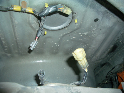タンクを下ろすとき、一気に下ろすとヤバイです。なぜならコネクタが付いていますから。フロートとポンプのコネクタです。これを外しましょう。 |