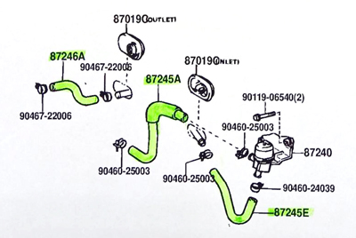 まずは分解図です。分解図中の品番は当時のものなので、今回の品番とは違っています。マーカーで塗られた部分のホースがヘリテージパーツとして発売されました。