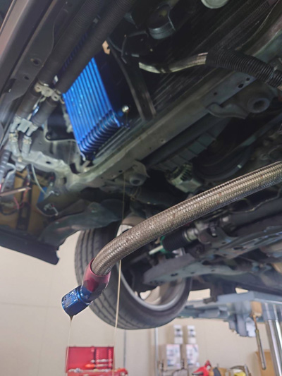 ここからはおまけ、というかこの作業をするついでにパイピングも交換したんだっけ(^^ゞ はるか昔に取り付けたオイルクーラーのとり外しです。高圧ホースからオイルが漏れていました。青い物がオイルクーラーです。 いつもお世話になっているトヨタカローラさんの紹介で、GRガレージでの作業となりました。そこの担当の方、以前はトヨタカローラにいらしたそうで、その時から私の車を整備してくださっていたと!だからこの車のことはよく知っていますよ!って(^^ゞ |