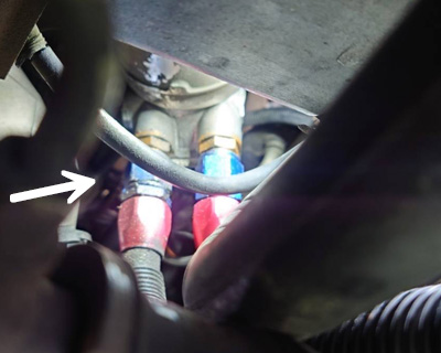 そんなこんなで、作業していただいたのですが…… なんと高圧ホースをサンドイッチにつなぐ部分のOリングが入っていなかったとのこと。(写真中白矢印の先の部分)Oリングが入っていなければオイルが漏れて当然ですよ……てか、そんな付け方したの誰だよ!(ちゃんとした業者ですよ……はぁ) |