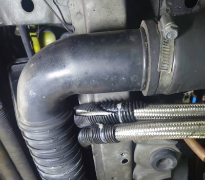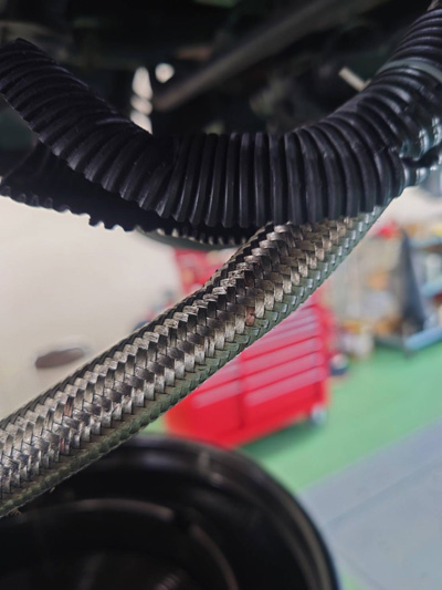さらに高圧ホースの取り回し…… ホースがインタークーラーに挟まれています。普通はこんな取り回しはしないとのこと。当然ですよね。 |