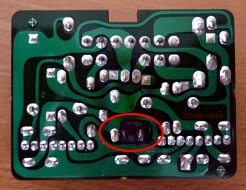 今回の壊れた基板です。特に雨漏りで壊れたというわけではなさそうですが、赤丸内が焼けこげています。歴代のランプフェイリアも全て同じところが焼けていました。 |