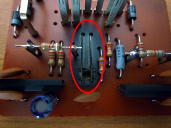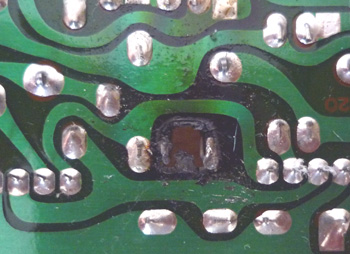 上の赤丸内のアップです。今回の壊れ方は今までで一番ひどく、基板に穴が空いていました。ここであきらめようとも思ったのですが、こんなものに1万以上も出せるか!という思いで修理を決行! |