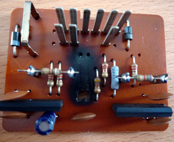 基板の表層パターンは分かるのですが、ICの中で何をやっているのかとか、もしかしたら2層基板だったらとか、色々悩みましたが、とりあえず表層パターンだけ考えてやろうと言うことでチャレンジ!表層パターンを追っていくと、先ほど外した2本のジャンパー線は、写真赤線のようにただ行って帰ってきているだけでした。(絶対そんなことはないと思うが・・・) |