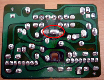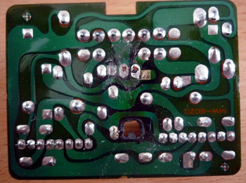 とりあえず焦げている部分のジャンパー線(銀色の針金2本)を外します。無理矢理引っ張らず、半田ごてであたためながらゆっくりと丁寧に引き抜きましょう。 |