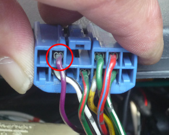 またまた配線図とにらめっこ。写真赤丸内の紫の配線を抜けば、警告灯は点灯しなくなることが判明。 |