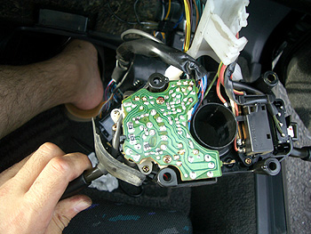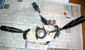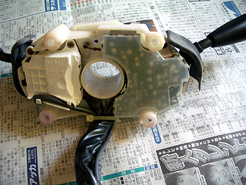 これは購入したカルディナのユニットです。向かって右側のレバーがワイパーなのですが、この部分に基板がついています。70には基板はありませんので、果たして移植できるのか、この時点でかなり心配になります。とりあえず、ワイパーレバーの部分を外してみます。 | |||||||||||||||