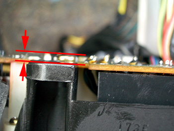 干渉する場所の一つは、この写真の赤丸の部分。もう一箇所は・・・写真がない(;¬з¬) なんと言えばよいか・・・70のレバーを固定している爪がちょうど基板のど真ん中にあたるんです。この爪を切り落とします。 |