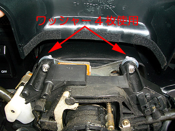 こんな感じで取り付けました。写真では2箇所ですが、下側にもあと2箇所ありますので、ワッシャーは合計で16枚使用しました。 | |||||||||||||||