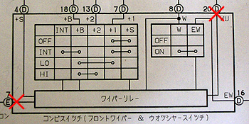 カルディナのフロントワイパーの配線図です。 赤で×印をした配線は、スープラにはないものです。ですので、未接続とします。 |