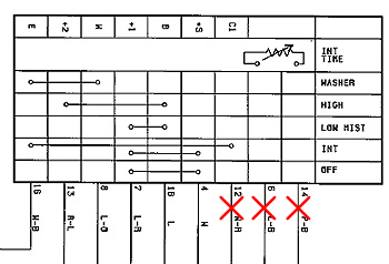 スープラのフロントワイパーの配線図です。 赤で×印をした配線は、カルディナにはないものです。ですので、無視します。 |