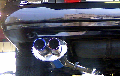 こちらが今回交換した、RED FIELDオリジナルデュアルテールマフラーです。テール部分がチタン風です。