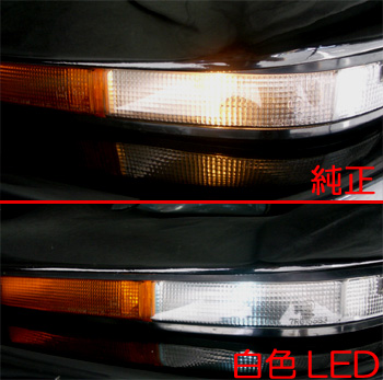 上の写真は純正のポジションランプです。 下は白色LEDに変えた物です。 だいぶイメージが変わりました。でも、やっぱりもう少し白いLEDが欲しいですね・・・ |
