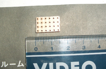 作業手順ですが、まず、ユニバーサル基板をこれくらいの大きさに切ります。その後、ソケットに入るぎりぎりの大きさまでヤスリで削り、微調整します。 |