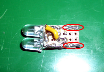 ユニバーサル基板にLEDを実装します。ポイントは、ソケットの電極につながるよう、写真赤丸内のように半田を盛って電極を作ります。現物合わせしていい感じになるまで半田を盛ります。 |