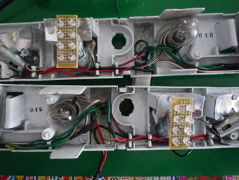 作業手順ですが、他のLED化した部分と同様、とりあえずユニバーサル基板を適当な大きさに切って、LEDとチップ抵抗を実装します。そして、純正の電球を割ります。純正の電球のソケット部分を使います。 このとき夢中で作業していたので写真がない・・・Σ(゚д゚lll) きれいに電球を割り、電球のフィラメント部分につながる細い銅線を今回作ったLEDにつなぎます。その際、+−を間違えると点灯しませんのでご注意を。 |