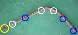 これはモールを外した車両側の写真です。青○、白○は上の写真のものと対応しています。黄矢印は上の写真の黄○と対応します。 |