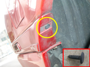 モールを外す手順ですが、まず、黄○のパッチン留めを外します。小さなマイナスドライバーなどでこじれば簡単にはずれます。取り付けるときも押し込むだけと、非常に簡単な部品です。 |