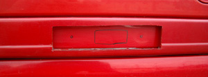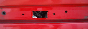 穴開け位置のマーキングに従って切ったところです。汚い・・・(笑) 当然ですがボデーを切るときはモールは外して切ってください。 切ったところは塗装がはがれてしまいます。そのままだと錆びる原因にもなりますのでタッチペン等で塗装しておきましょう。 |