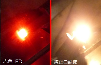 | LEDと白熱球の比較です。これだけ見るとLEDが暗く感じてしまい、かなり不安になります。幸い、一番上の写真にある通り、何も問題はなかったので良かったですが。 | |