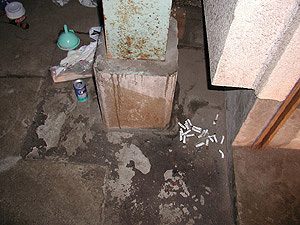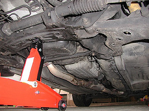 何回目かの”流入”を終えた頃でしょうか?何となく嫌な予感がして、残りの量を考えてみました。どうも量が足りなそうです。発泡を恐れて湯せんなどで暖めるという手法をとらなかったためか発泡率が不足したのかもしれません。慌ててドライヤーや200Wの電球を持ってきてボディ側を暖めました。時、既に遅し。結局、6Lセットでは不足することが確定的になってしまいました。一生懸命にボティと混合前のウレタンを暖めましたが前後左右を入れるのが精一杯。せめて2回目はジャッキアップしないで出来るように真ん中だけを残すこととしました。でも、説明書には「完全硬化まで24時間以上はエンジンも掛けるな!」などと書いてありますが、ジャッキを降ろすときには”ガンッ!”って凄い勢いで降りてきます。これだけで大分剥離したでしょう。”バキッ!”とか言ってましたし(笑) |