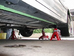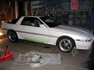 発泡ウレタン施工 JZA70エアロトップリミテッド平成3年式 待ちに待った発泡ウレタン施工。あちこちのHPを見せて頂き、頭の中では既に”剛性”の上がった愛車が走っていたのだが、現実には時間が取れなくて相変わらずエアロトップの”グニャグニャ”ボディで走行していた。まずは愛車を前にして頭の中でシュミレーション。今までシュミレーションだけは何度もやっていたのだが、それ以上はやってみないと実感が湧かない。とりあえず一番大事なのはジャッキアップを安全に!次には発泡試験を丁寧に実施してイメージを膨らませ、あとは念を入れたマスキングが重要だという事はわかっている。ホームセンターで購入したジャッキ2980円のシェイクダウン。さて、何処にセットしようかで迷う。迷う。迷う。結局何処だかわからない。世話になっている店に電話するが、日曜なので誰も出ない。困ってしまい、すがる想いで船田さんに電話した。すると船田さん、丁寧に教えてくれて事なきを得た。ありがとうございました!さて、位置も決まったのでジャッキの付属の棒でアップする。最初はフロントをジャッキアップして後ろから注入開始する準備。お教えいただいたポイントにジャッキをあて、ストローク開始!コツン! おっ!! 車高が低くてジャッキの棒が上下できないためにジャッキアップが出来ん!!仕方ないので細めの鉄の棒を持ってきて地道にジャッキアップ。 ある程度の高さまでアップしたら付属の棒で一気にアップ!何とか馬をかませられる高さまでアップできた。 |
