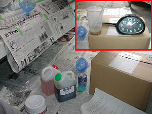 さて、発泡テスト。主剤、硬化剤の2液混合タイプ。説明には100cc同士を混ぜ合わせると書いてあったが、足りないなどというけちなことになると嫌なので50ccで試した。それでも500ccのプラスチックコップに溢れてきたのだからかなりの発泡率。それもかなり熱くなる。ジョウゴとコップと割り箸にも液体ワックスを塗りたくり、ビニール手袋にもベタベタにワックスを塗る。さて、作業開始!最初は粘度の高そうなB液をコップに入れる。最初は遠慮気味に50cc入れる。そして他のコップにA液を同量。これをドキドキしながらB液を入れたコップに注ぐ。気合いを入れて混ぜ合わせる。どんどん濁ってきてシュワシュワ言い始めて注入! |
