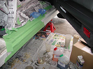 ちょっと待てよ。馬を噛ませる所ってボディの継ぎの部分だよな。ということは先にマスキングしておかないとここから漏れるぞ。てなわけでジャッキアップしたままサイドシルの下の一部、ジャッキポイントを先にマスキングしました。馬を噛ませてジャッキダウン。既に大仕事を終えたように魂が抜けかかっている(笑)抜けかかった魂をマスキングで抑えて、車の方のマスキング。これは殆どが車の下を覗き込みながらの作業。新聞紙を敷いて仰向けにねっころがりながら丁寧にマスキング。これをしっかりやらないと漏れてくるからね。 |